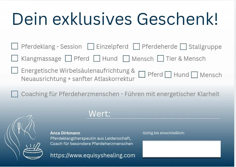 Der EquiSysHealing®‑Geschenkgutschein ist eine besondere Geschenkidee für alle Pferdeherzmenschen – für alle, die ihrem Lieblingspferd oder einem geliebten Menschen etwas wirklich Wertvolles schenken möchten: Zeit, Verbindung und energetische Begleitung.